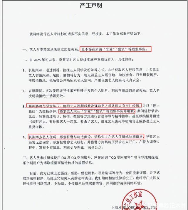 荣梓杉工作室的声明回应,也是没什么人买账。工作室表示所谓“恋爱”“出轨”等均为虚假事实。并称李禹熹对荣梓杉长期跟踪、言语骚扰、精神胁迫与恶意施压,对他造成了严重困扰,李禹熹还以跳楼,拉着艺人一起死等行径逼迫荣梓杉,对此工作室都已经搜集证据。工作室还公布了北京市公安局的立案告知书。
