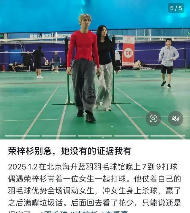 有意思的是,工作室的回应很快遭到吃瓜群众打脸,有网友晒出今年1月份偶遇荣梓杉跟李禹熹在北京打羽毛球的照片。照片中,荣梓杉穿着随意,头发染了黄色,女生则是素颜。网友还爆料荣梓杉打球素质不高,全场调动女生,冲着女生身上杀球,赢了之后还满嘴垃圾话。1月份这个时间点,跟李禹熹的爆料也对上了。