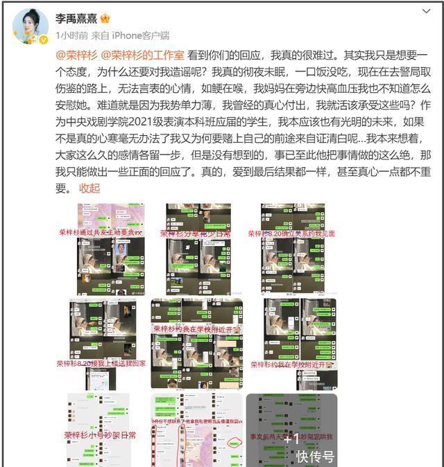 李禹熹坦言如果不是真的心寒,毫无办法了,自己不会赌上自己的前途来自证清白:“我本来想着,大家这么久的感情各留一步,但是没有想到的,事已至此他把事情做的这么绝,那我只能做出一些正面的回应了。”李禹熹晒出了她跟荣梓杉交往过程的聊天记录,力证两人恋爱过。